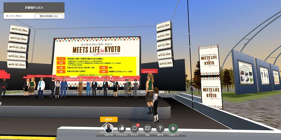 京都市においても、地域の魅力の発信拠点であるメタバース「京都館PLUS X」(京都市から構築・運営をDNPが受託)*1で、2024年3月27日(水)19:00~21:00に、「MEETS LIFE IN KYOTO」として移住相談会を開催します。また、DNPが桑名市と 実証事業を行っている「メタバース役所」*2と連動させて、移住関連の交流・相談会のラインアップに子育てやライフプラン等も加えて、関係人口の増加にも貢献していきます。