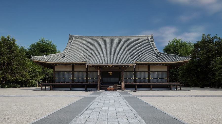 仁和寺「金堂」は慶長年間(1596~1615年)に造営され、後に仁和寺に移設された日本に現存する最古の紫宸殿(ししんでん、内裏の正殿) です。DNPは文化財のアーカイブ事業などで培った独自技術で、宮殿建築ならではの細部の装飾や、時を経た外壁の木質など、文化財が持つ美しさや歴史的価値を3DCG上で精密に表現しました。