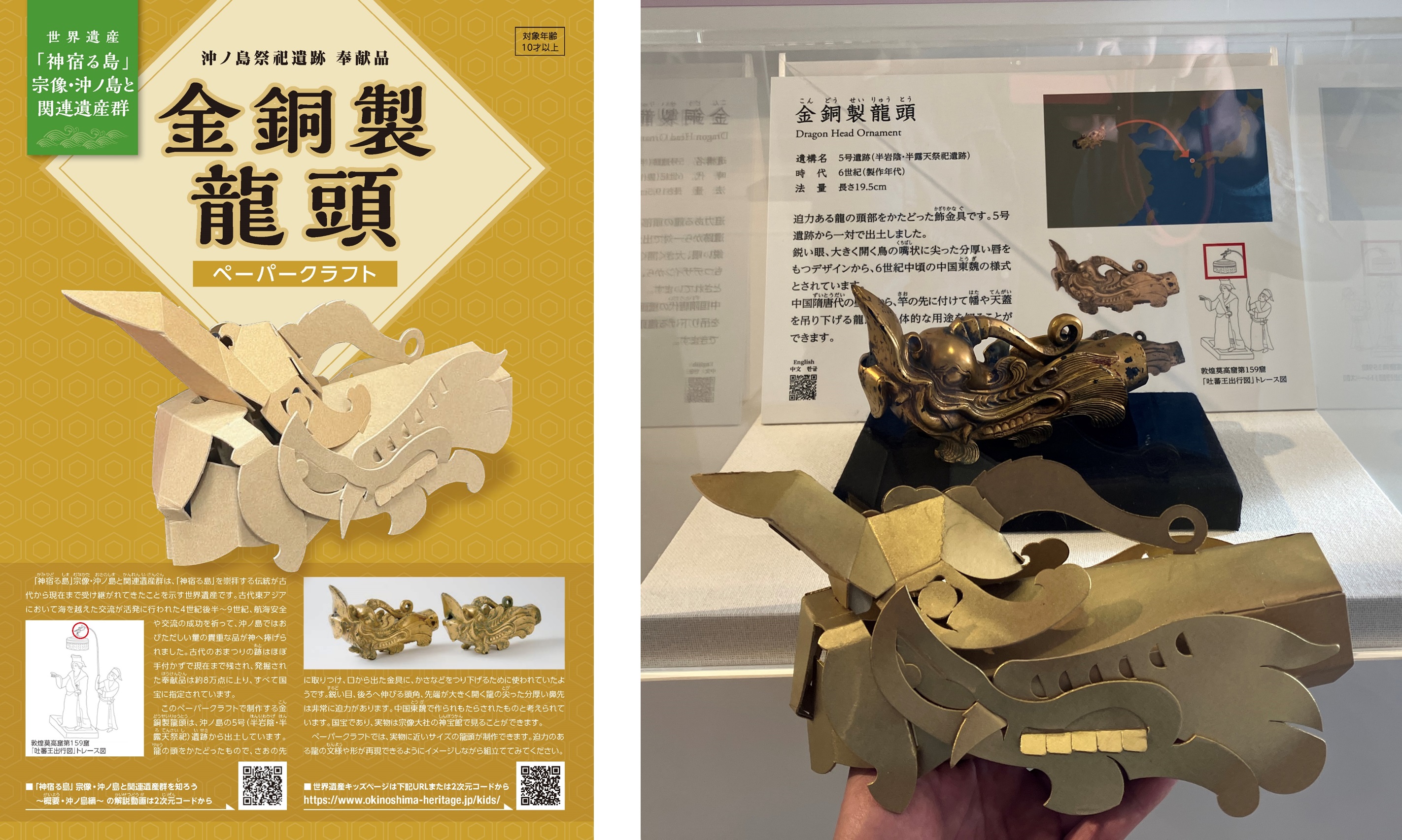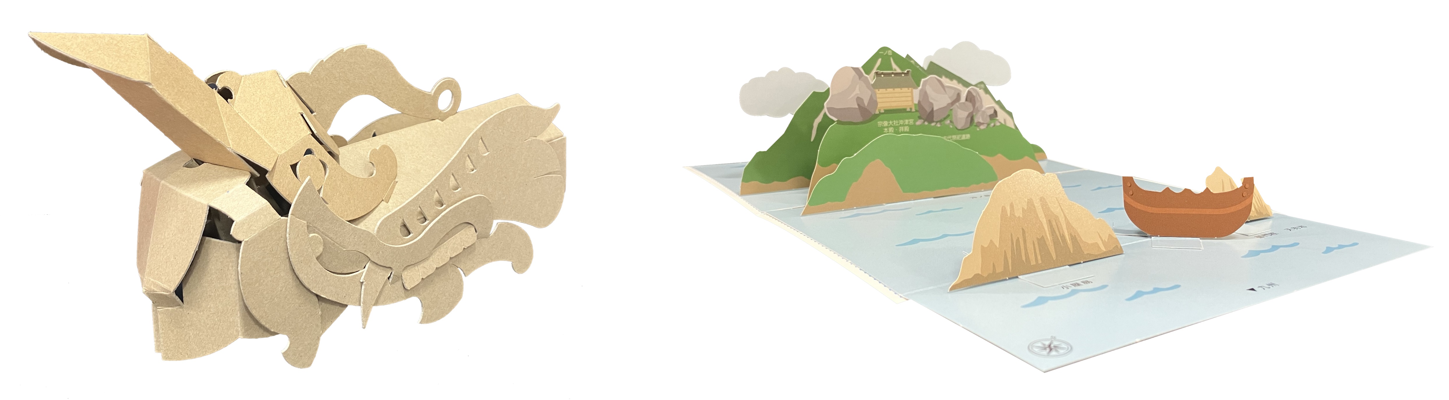 金銅製龍頭ペーパークラフト(左)と沖ノ島ポップアップカード(右)