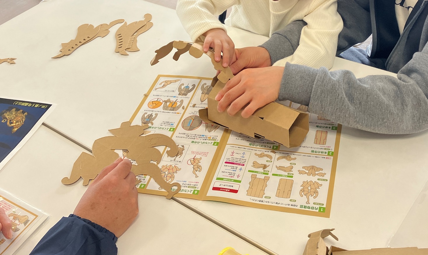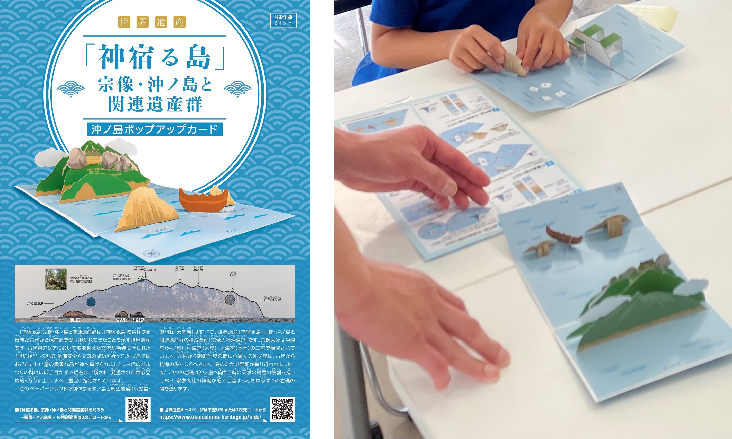 沖ノ島ポップアップカード学習キット(左)と制作時の様子(右)