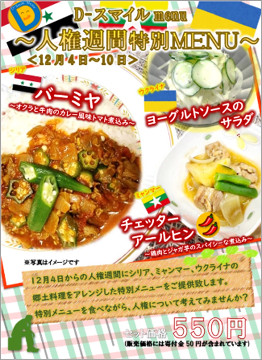 社員食堂の支援メニューのポスター:「世界難民の日」に合わせたメニュー(左)、「人権週間」に合わせたメニュー(右)