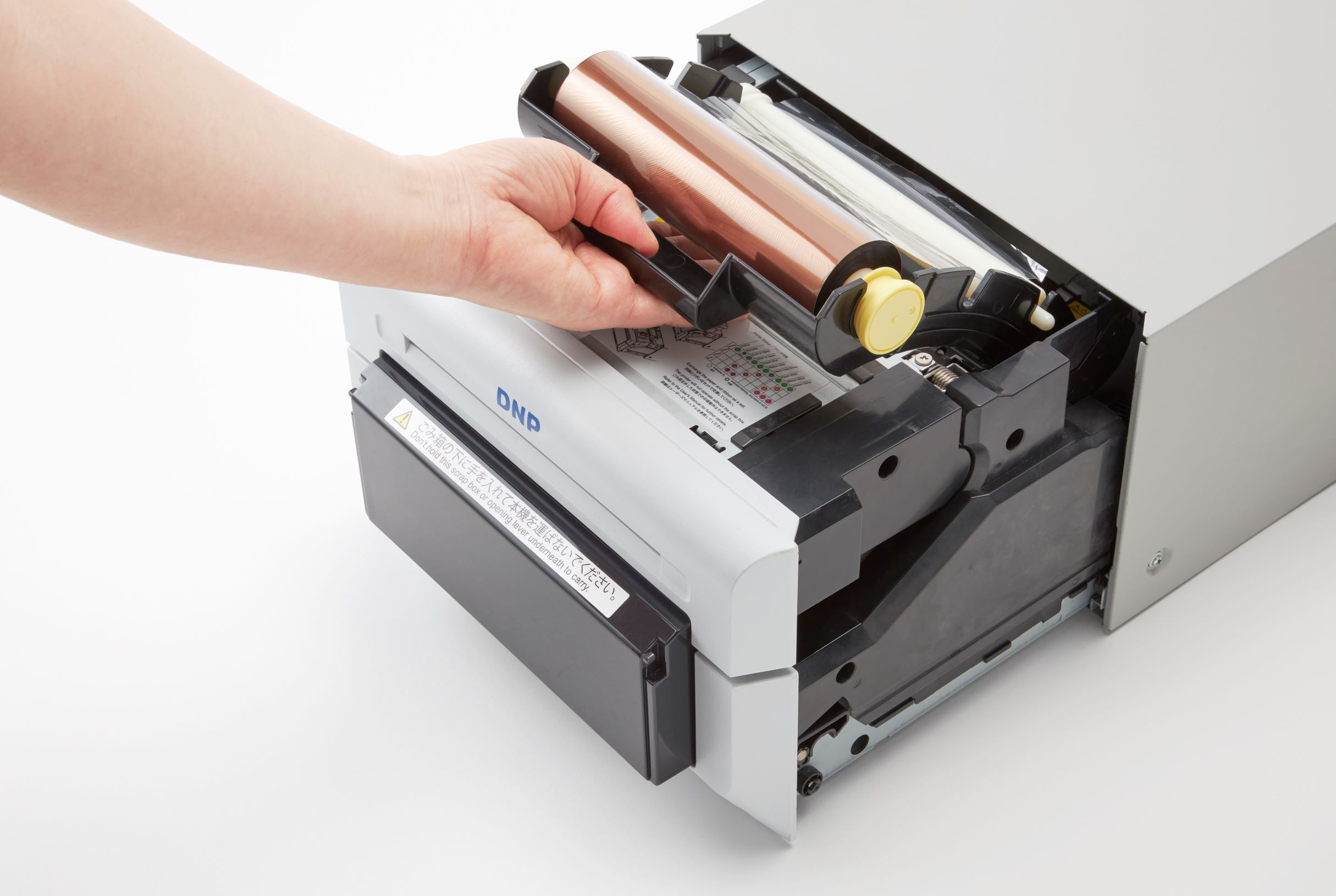 DNP製のフォトメディアを紙で梱包したイメージ(奥:用紙、手前:インクリボン)