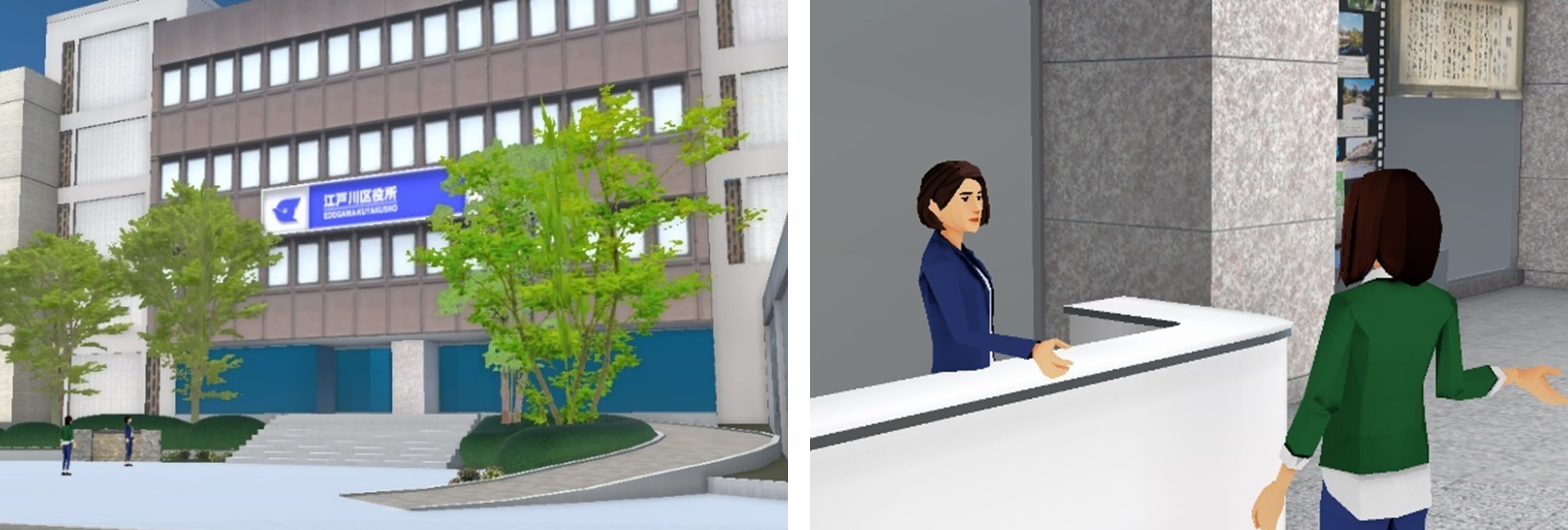江戸川区「メタバース区役所」の外観(左)と受付(右)の様子