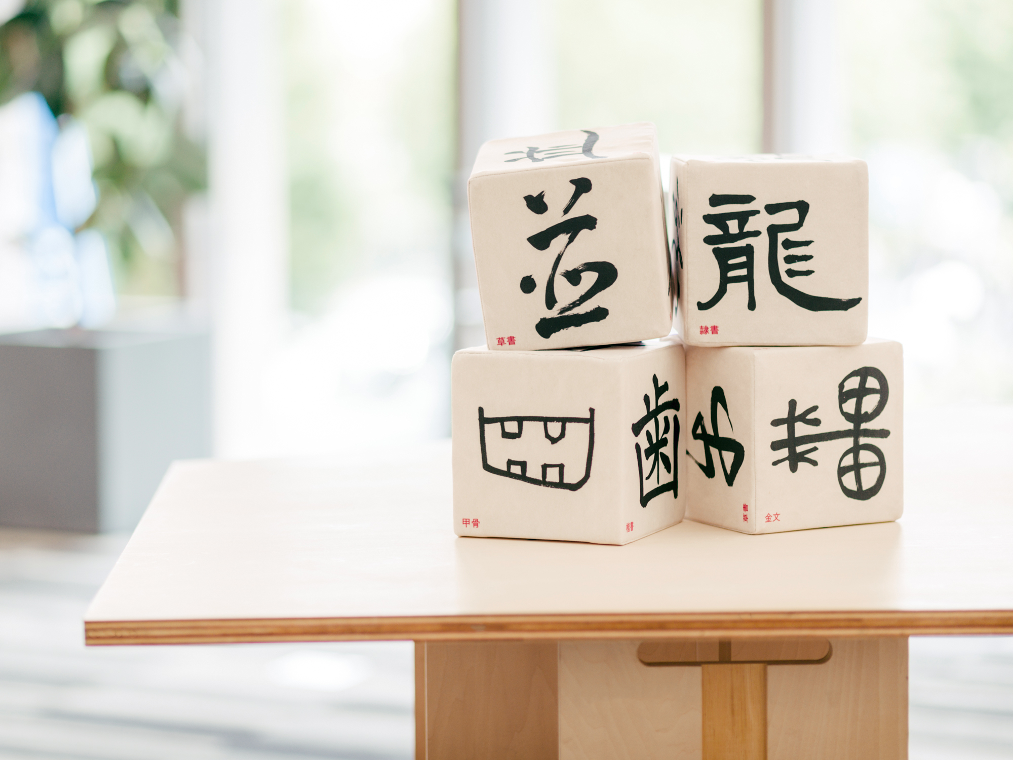 - サイコロ : 1~6の目の代わりに、同じ漢字の六書体を六面に配置したサイコロを用意しました。来場者は会場で、出る面ごとに書体が変わるサイコロを実際に転がしながら、同じ漢字の書体による形の違いを体感することができます。