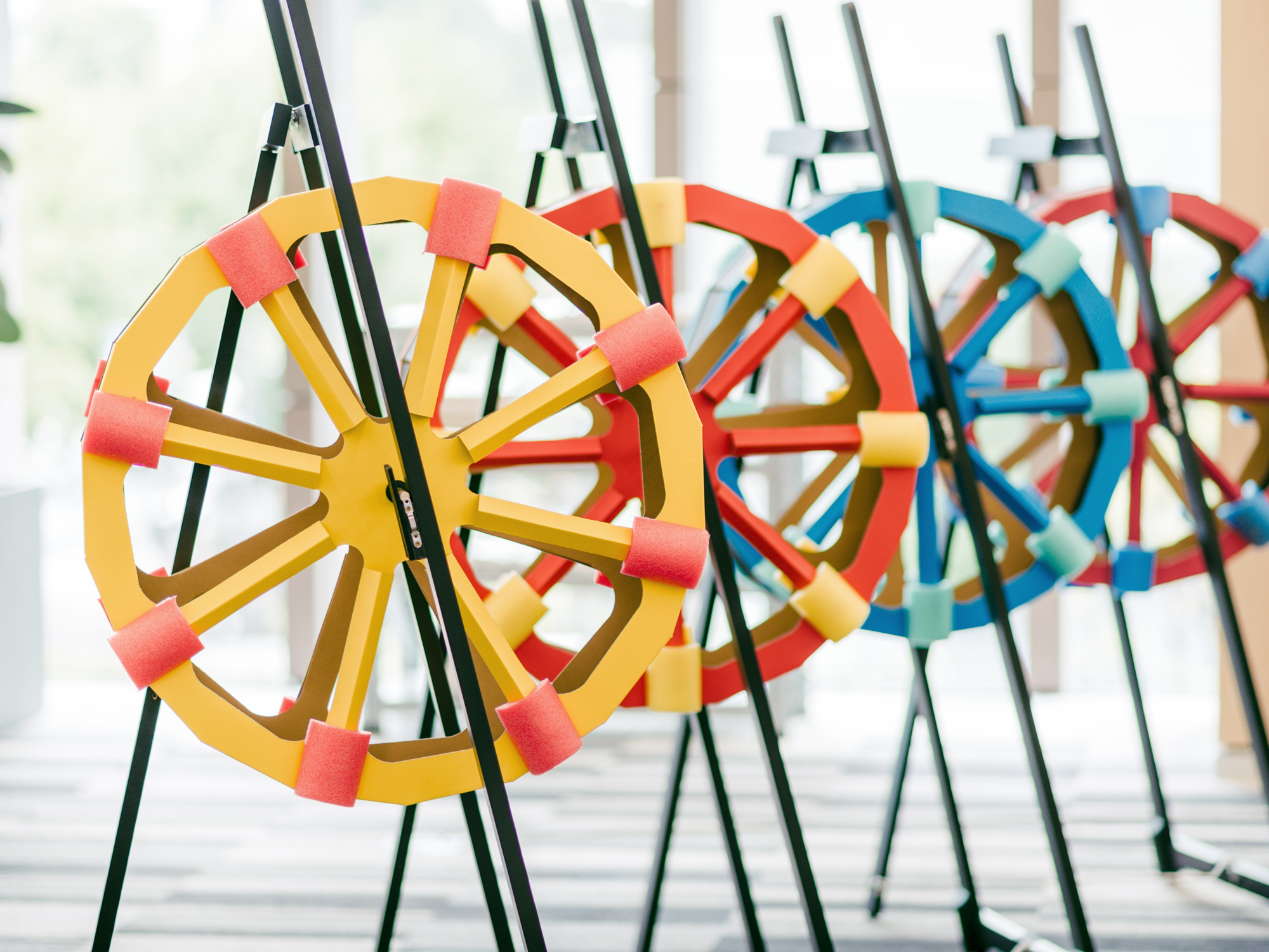 - DNPプラザ1Fの喫茶コーナー「問いカフェ」では、「サイコロ」と「ゾートロープ」をモチーフにした横断幕を展示します。
