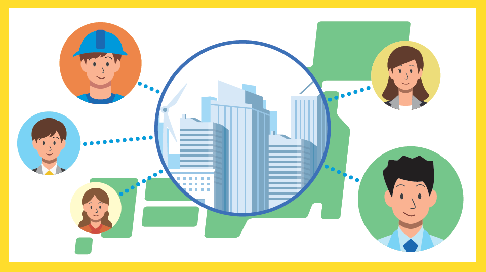 一人ひとりの資格・経歴・就労履歴等のデータをサイバー空間とフィジカル空間で相互に連動させて、時間・距離などを超えた「働く」環境を構築します。個人のライフスタイルに合わせた自由な働き方を可能にすることで、人と仕事が集まり、地域の活力を高める「働き方」をつくります。