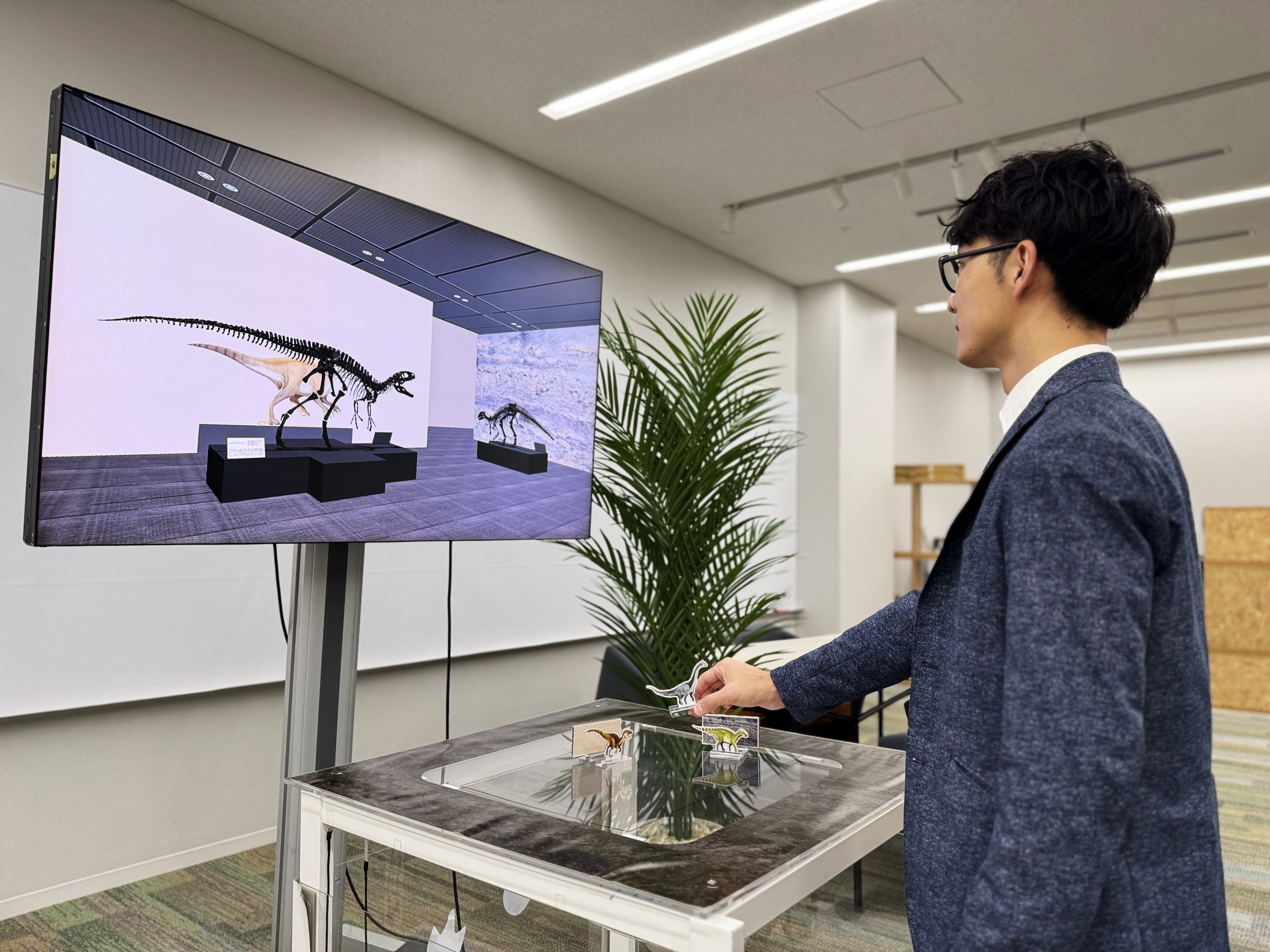 画像認識とVR(Virtual Reality:仮想現実)の技術を用いてDNPが開発した本システムは、恐竜や備品等の展示物のミニチュアを来場者が自由に配置することで、ディスプレイに映る展示会場が原寸のスケールで組み上がっていきます。今回、同大学が保有する「福井県で発見された恐竜の全身骨格3Dデータ」と本システムを掛け合わせることで、研究・教育にも有効な学術コンテンツを共同開発しました。2024年7月17日(水)から、福井県立恐竜博物館の本館3Fで公開します。