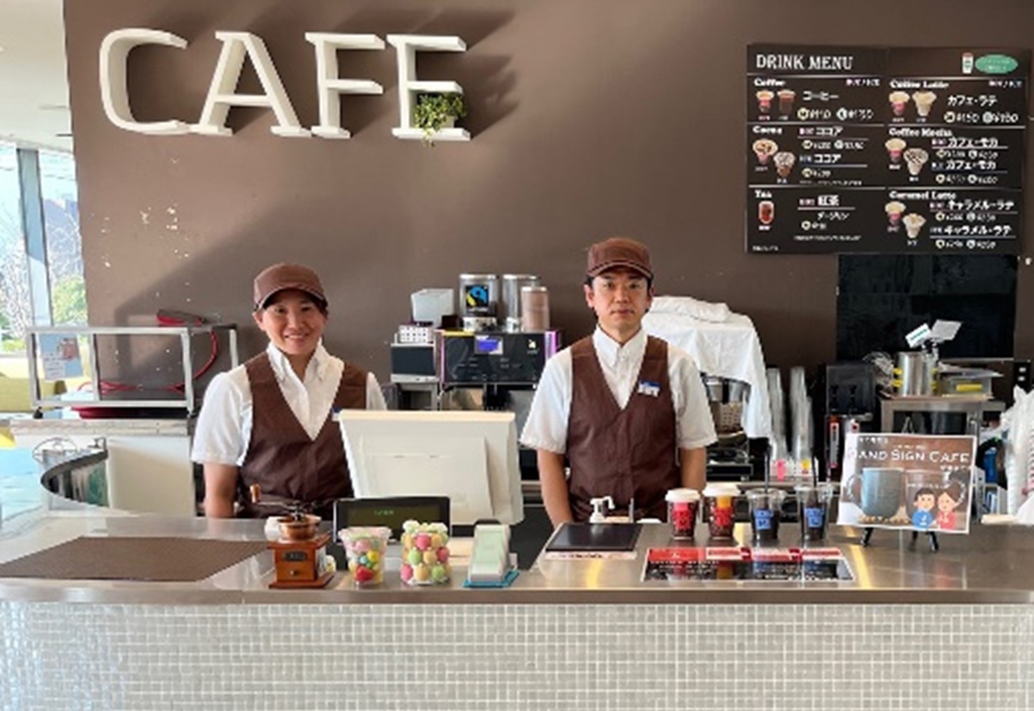「フェアトレード・ワークプレイス ゴールド」登録事業者マーク(左)と認証コーヒーを提供する社内のカフェ(右)