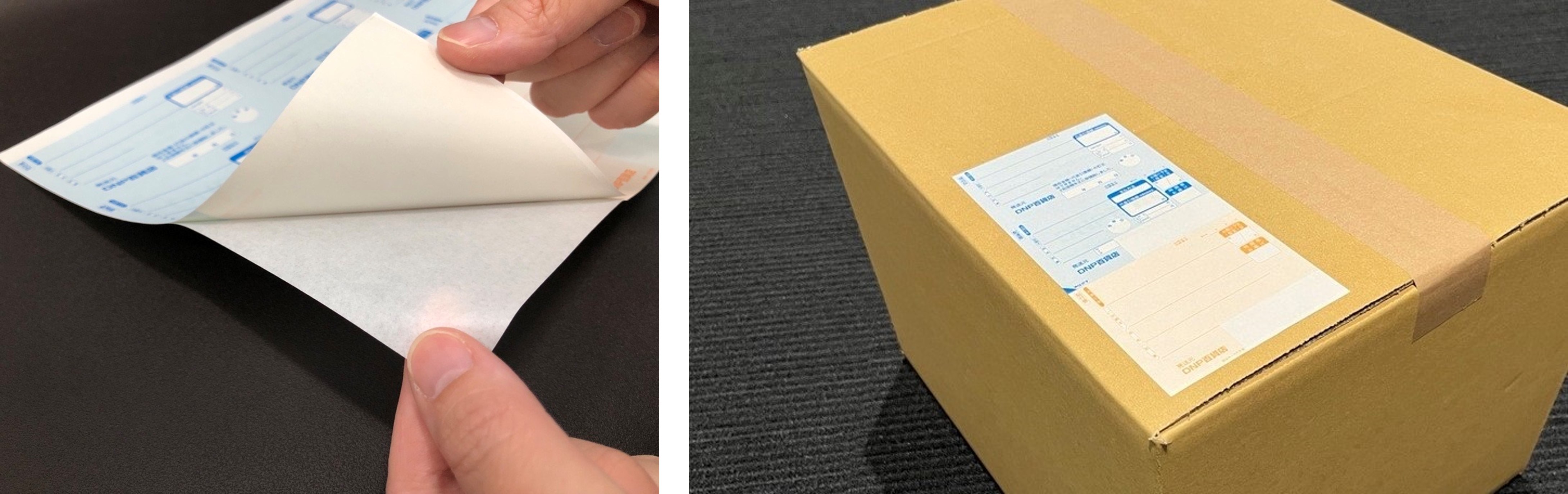 (左)「ラベル伝票」のイメージ、(右)段ボールに貼った「ラベル伝票」のイメージ