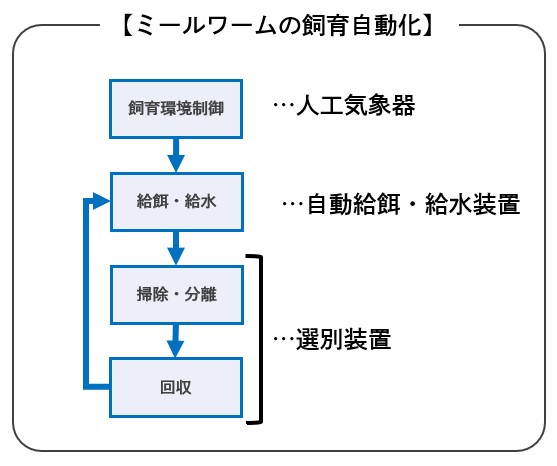 - 人工気象器: 温度・湿度・照明などの環境条件をコントロールする装置です。ミールワームが最も成長しやすい条件を追求します。
