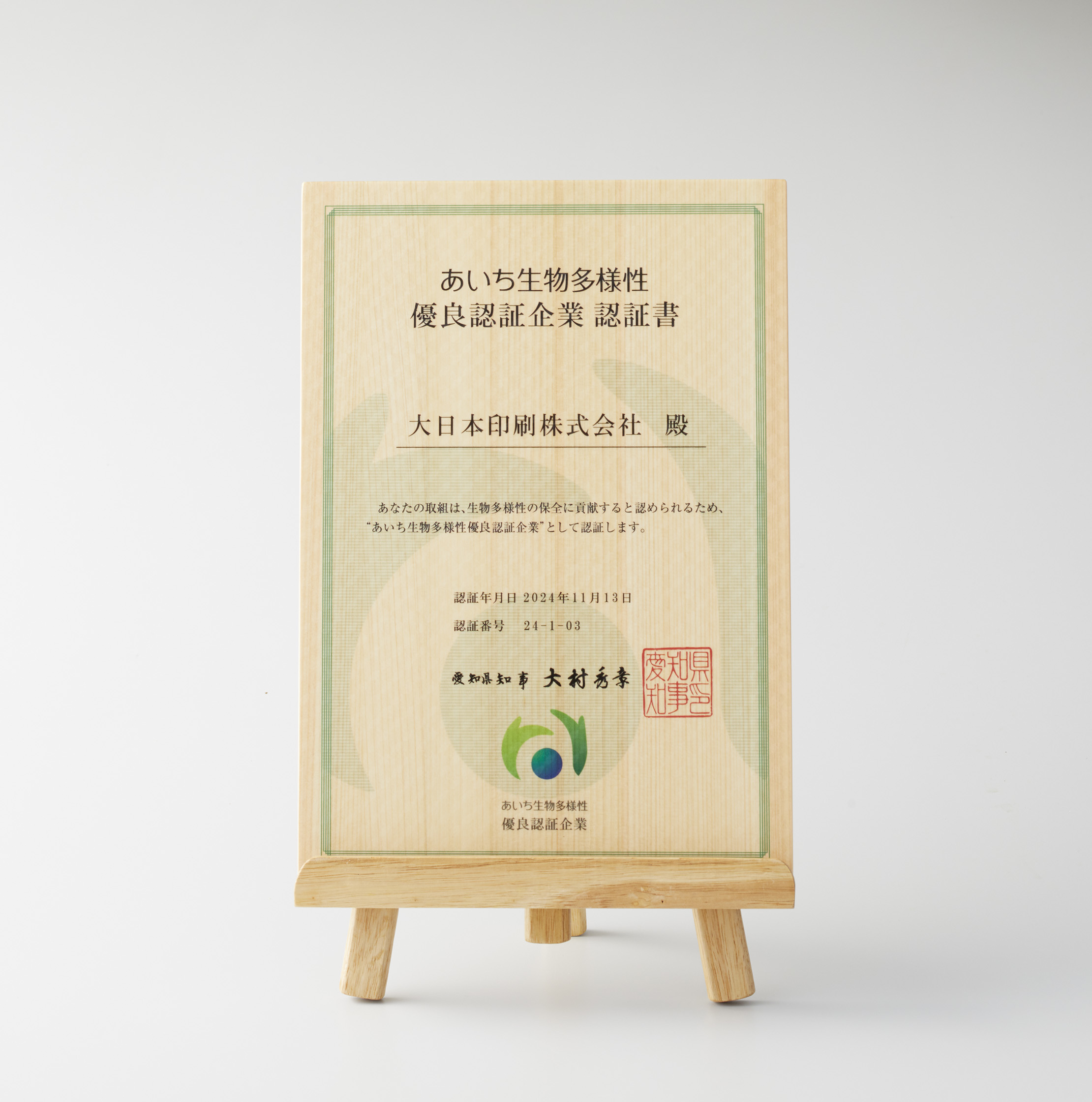 DNPグループは常に、事業活動が生物多様性に影響を与えることを認識し、自然共生社会の実現が企業の持続的成長に不可欠であると考え、バリューチェーン全体での生物多様性への影響の最小化と、地域生態系との調和を目指したさまざまな取り組みを推進しています。こうした活動が評価されて、今回、愛知県から標記の認証を取得しました。
