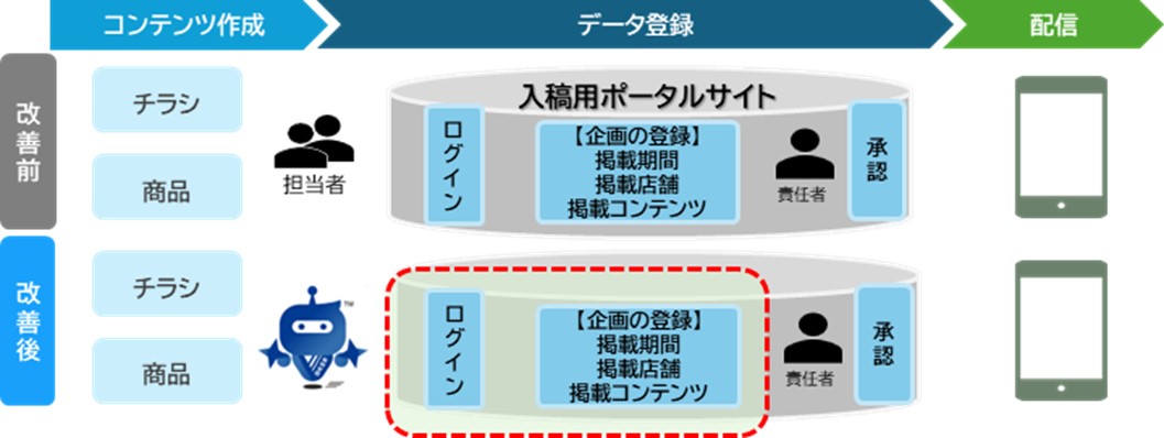 RPAソリューションでは、指示書の内容に基づき、入稿用のポータルサイト上での配信コンテンツの登録・配信設定をRPAが代行(自動化)します。これによって担当者の作業は、以下の項目の(1)画像や商品原稿の制作と(6)承認のみとなります。複数のプラットフォームの連動で複雑さを増すデジタルチラシの運用業務負荷の削減が期待できます。