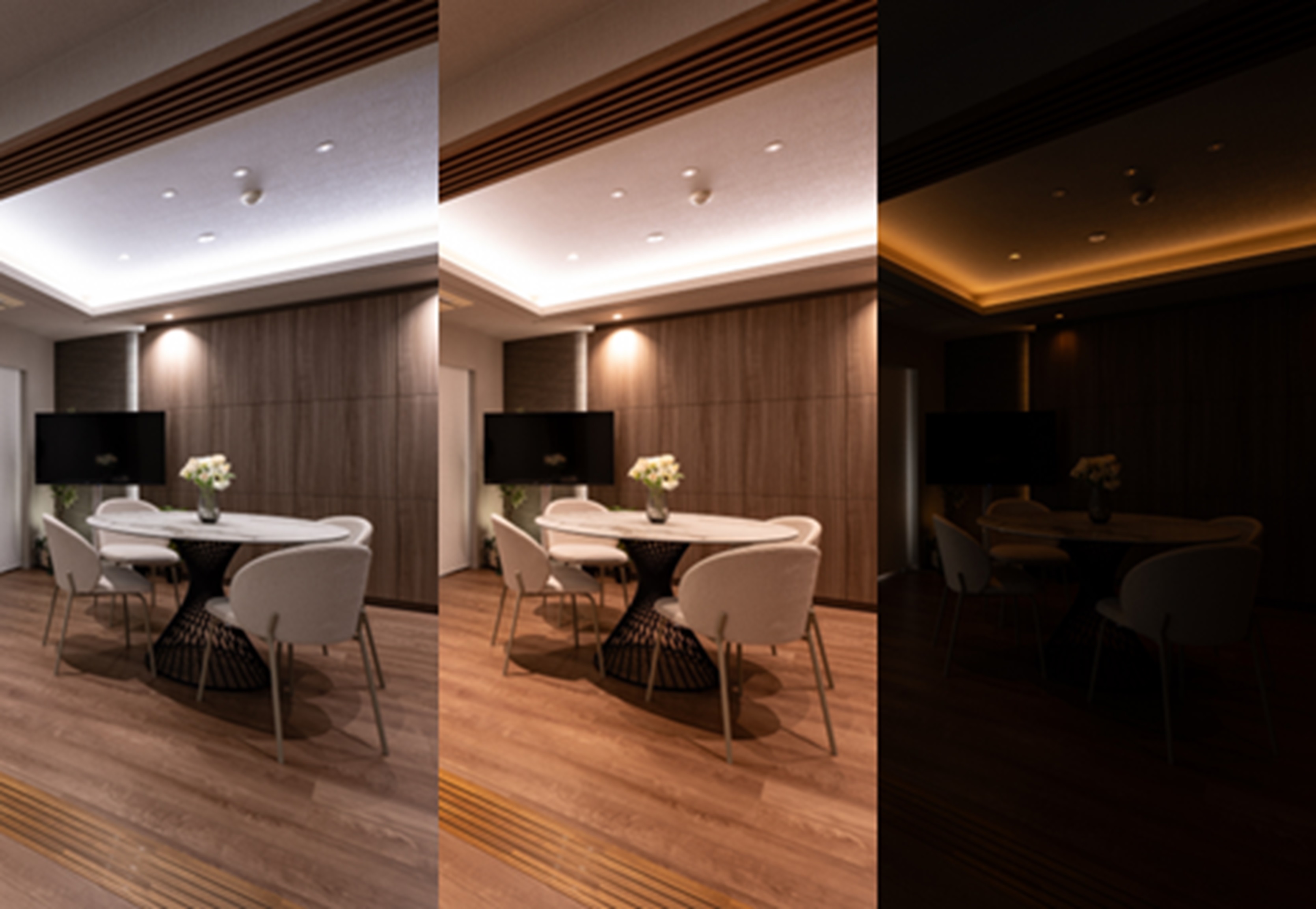 一日の流れを5つのタイムゾーンに分け、それぞれの時間帯に応じた最適な照明を自動で調整し、デザインと機能が融合したライティングシステムを搭載しています。人間のサーカディアンリズムに合わせて自然の昼夜サイクルに基づく照度と色温度に照明を自動調整し、時間帯に応じた快適な照明環境を実現します。例えば、朝は自然な目覚めを促し、昼は集中力を高め、夕方から夜にはリラックスして質の高い眠りに促します。その他、「映画を観たい」「静かに瞑想したい」「バーのような雰囲気でお酒を楽しみたい」といったシーンに合わせた照明設定も用意しています。