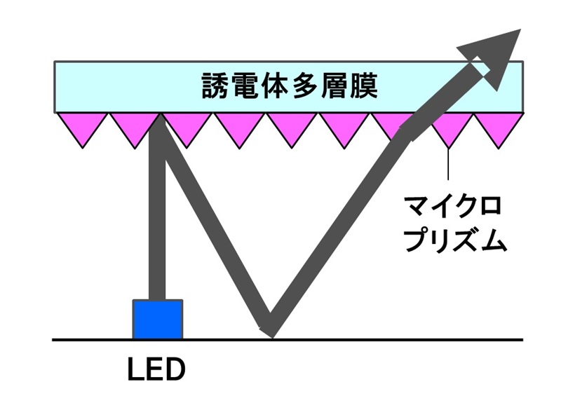 - LEDの真上に出た光は、ドットの映り込みにつながります。本フィルムの誘電体多層膜で、直線の光は透過させず、設計された入射角度の光だけを透過させることで、ドットの映り込みを低減します。