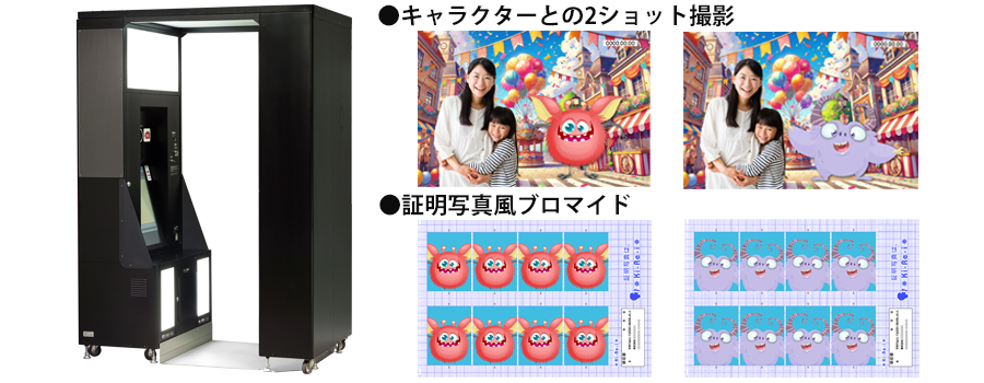オリジナル背景と人物を合成できる記念撮影フォトブースです。フォトブースの外観デザインは自由にカスタマイズ可能で、各施設への集客や話題づくりにつながります。DNPブースでは、好きなキャラクターと合成したツーショット風の撮影や、キャラクターの証明写真風のブロマイドプリントを体験できます。
