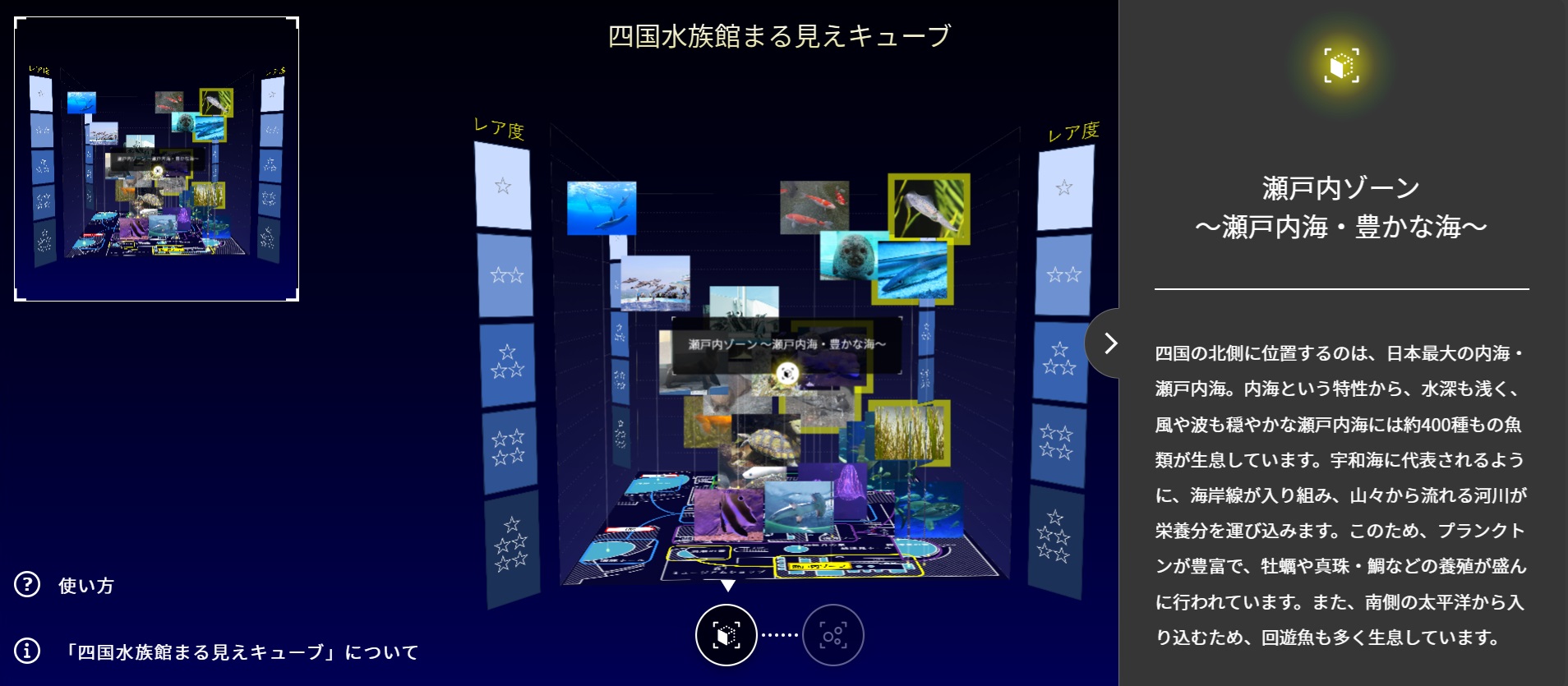 「みどころキューブ」は、立方体(キューブ)のインターフェイスで、利用者が直感的にコンテンツを操作できるシステムです。立方体の側面に「四国水景」のテーマで館内展示に使用している色を採用し、各ゾーンに展示している生きものがハイライト表示されるデザインにしています。立方体の底面に館内のフロアマップ、縦軸の指標に生きものの希少性を設定し、海の生きものをバーチャルな3次元空間内に配置しました。利用者が選択した生きものについて、学生の解説やワンポイント情報が表示されるほか、外部リンクや四国水族館の公式動画チャンネルにリンクして、より詳細な情報を閲覧することが可能です。また、生きもの同士をキーワードでつなげて相互の関係を示すことで、水族館内を回遊する感覚で利用者の興味を広げます。