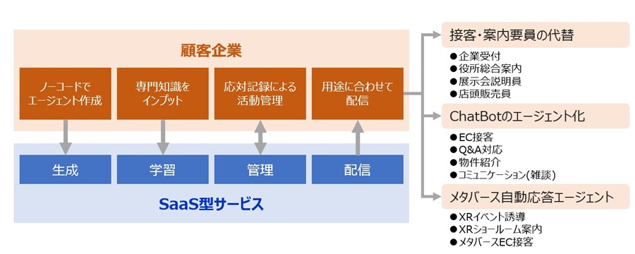 従来、AIエージェントとそのアバターは個別に制作した後で統合する工程が必要でした。本ツールは、生成AIの連携や知識データの入力を行い、アバターを選択するだけで、AIエージェント機能を搭載したアバターをプログラミング不要な“ノーコード”で簡単に構築できます。専門知識を持つ人材や企業等に委託することなく、利用者がAIエージェントを簡単に構築し、すぐに展開できるため、制作時間の削減や業務効率化につなげることができます。本ツールの導入により、Webサイトや店舗のデジタルサイネージ、メタバースなどでAIエージェントを使った接客や質疑応答など幅広い活用が見込めます。