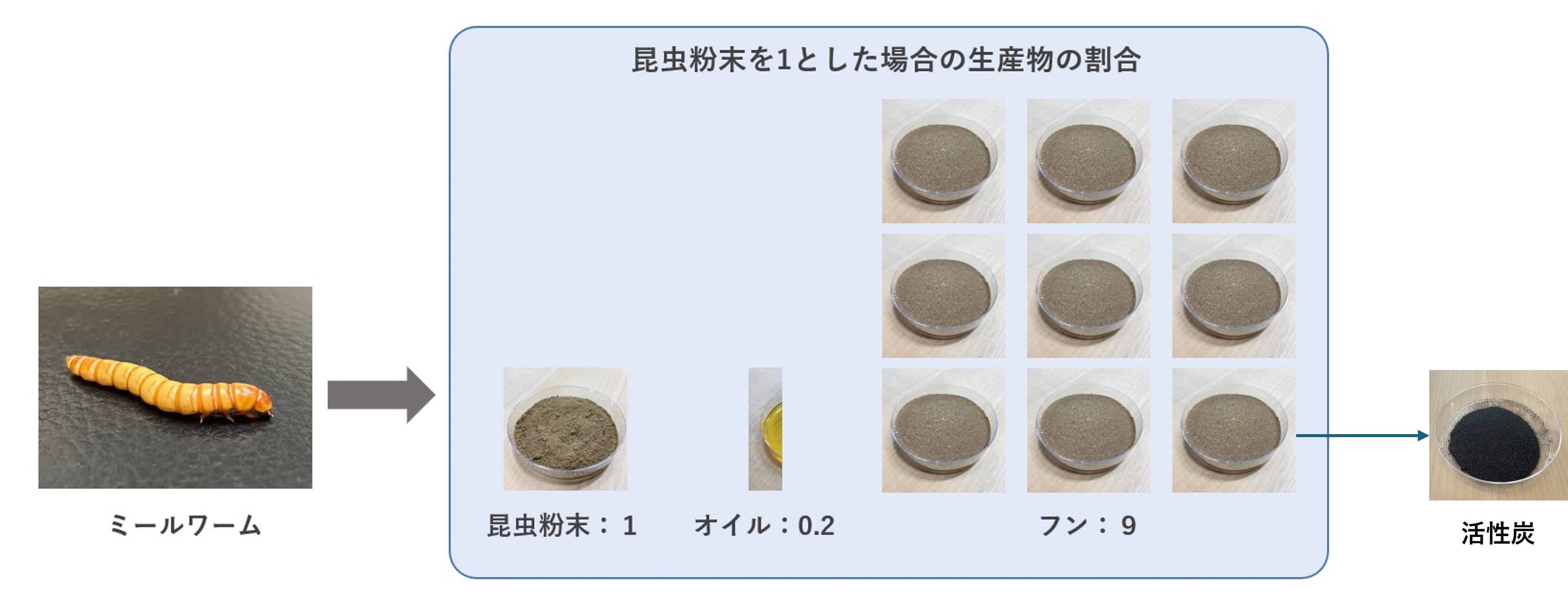 両者は、養殖魚のエサとなるミールワームの飼育自動化を目指す中で、そのフンが最終製品であるミールワーム粉末の約9倍(乾燥重量比)も出ることを把握しました*3。この大量のフンを、従来の農作物の肥料以外に有効利用できないか検討した結果、吸着性が高く、空気や水をきれいにするフィルターとして広く用いられている活性炭へと変換できることを発見しました。
