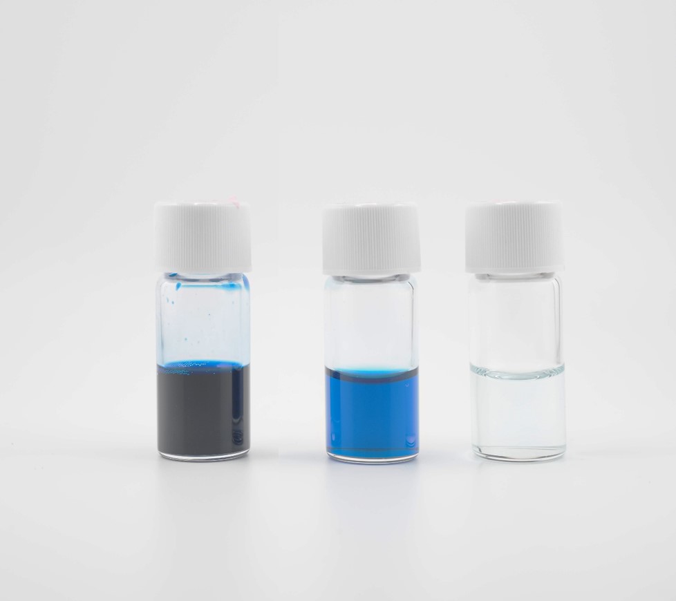 左)メチレンブルー水溶液のみ(活性炭未投入)、中)ヤシガラ活性炭投入後の状態、右)今回の活性炭投入後の状態=浄化の効果が非常に高いことがわかる