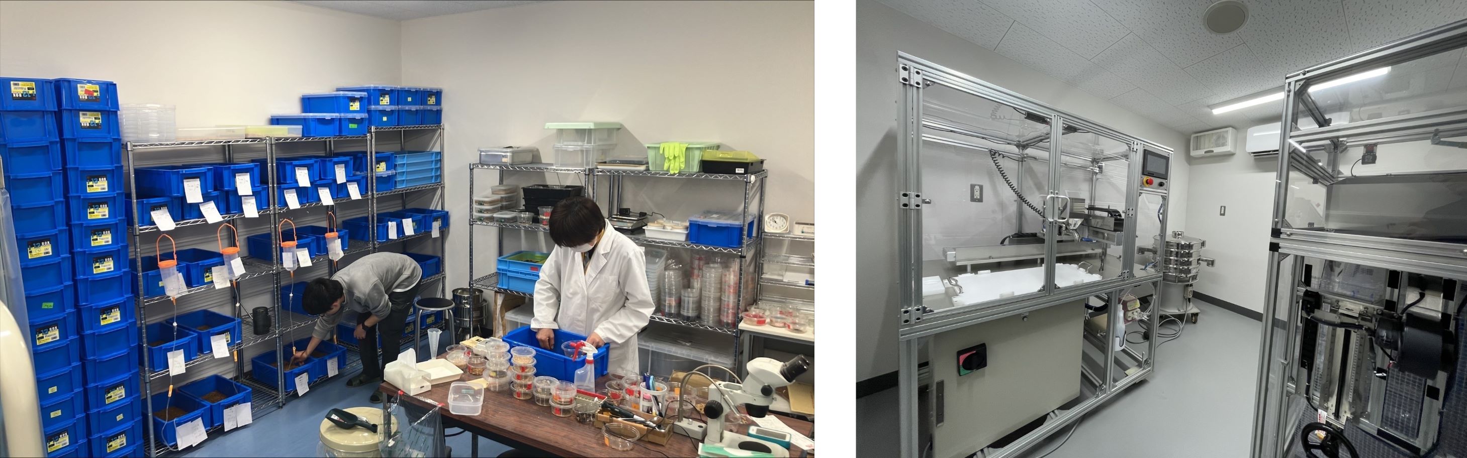 ○飼育・研究室と加工室の2部屋合計で100m2の広いスペースを運用