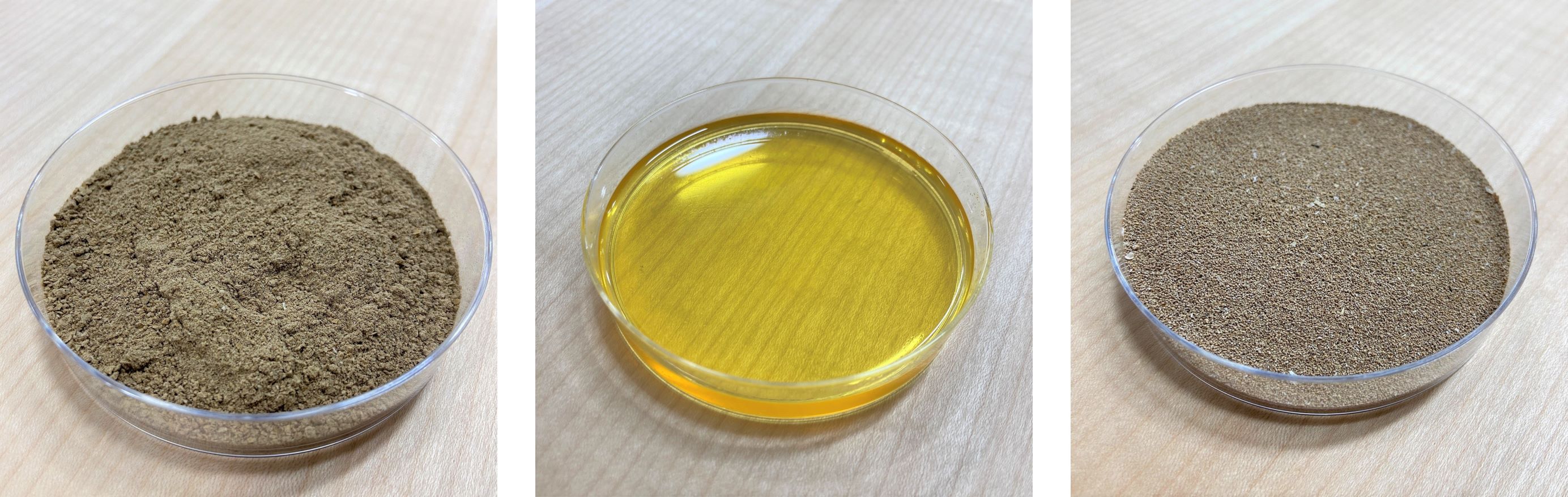 生産する昆虫由来の物質:(左)ミールワーム粉末、(中)オイル、(右)フン