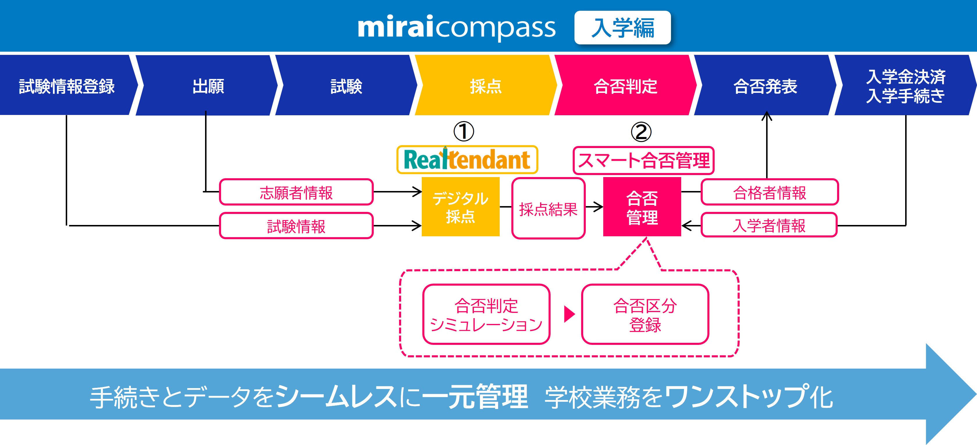 今回、第2弾として、①入試のデジタル採点に特化した「リアテンダント(入試版)」と②合否判定の決定プロセスを支援する「スマート合否管理」を2025年10月に、miraicompassシリーズの新サービスとして提供開始します。これにより、「出願~試験~採点~合否~入学手続」をワンストップで支援し、入試運営のさらなる業務効率化を支援します。