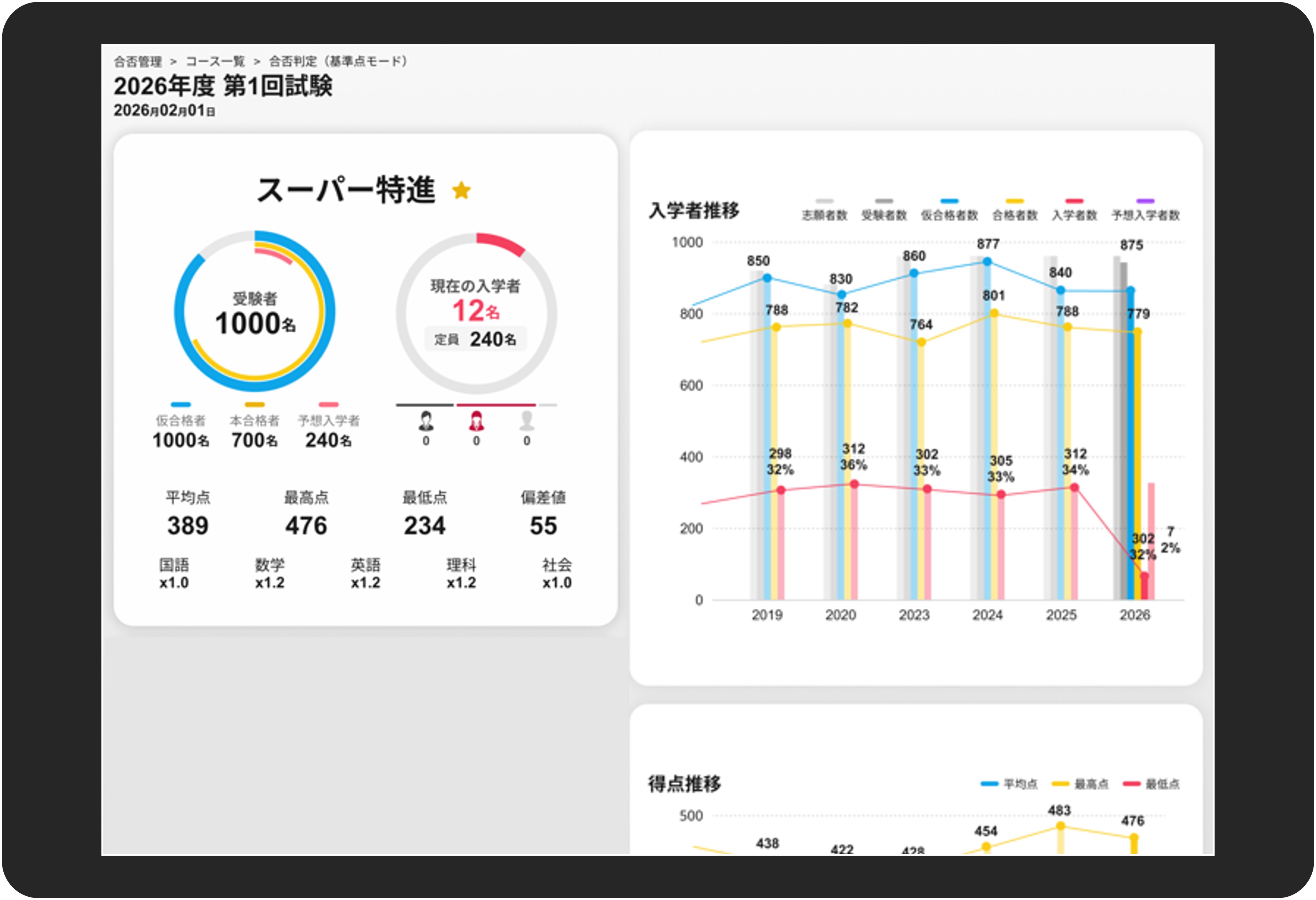 ・学校個別の判定項目取込みや試験ごとの合否ボーダーライン設定など、柔軟な設定が可能