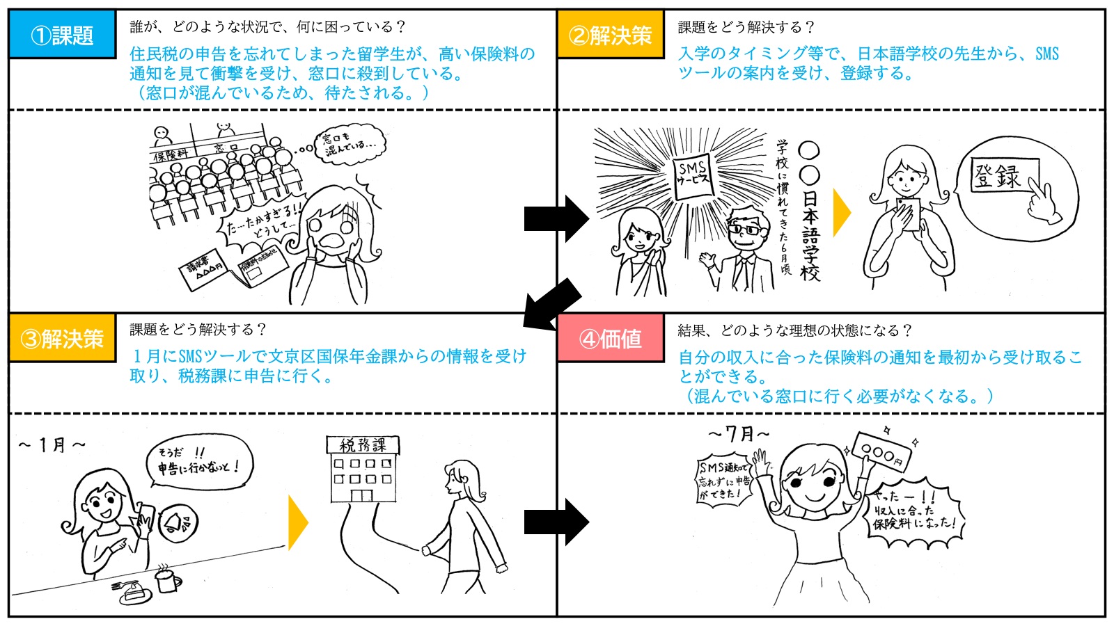 問題を解決するには、国民健康保険料の計算に必要な「住民税の申告」について外国人留学生が正しく理解することが重要だとわかりました。内容を理解して自発的に行動できるように、留学生のメリットが高くシンプルな表現の情報をSMS(ショートメッセージサービス)で配信するサービスを企画しました。日本語学校の先生が生徒である留学生にこのSMSの登録を促し、理解を深めてもらうことで、留学生の収入に合った保険料通知をはじめから受け取ることができ、問い合わせる必要が無くなる効果が得られると想定しています。今後は、次回の申告時期に向けて、より効果的なメッセージ送信サービスの検討を進めていきます。