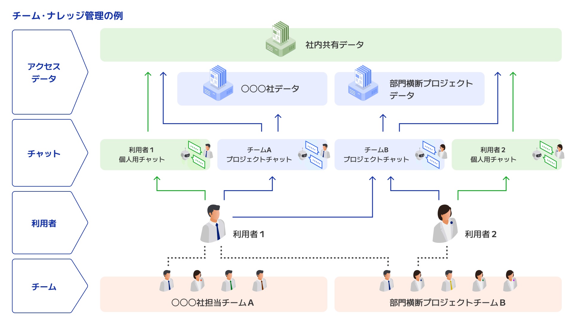 部門やプロジェクトの単位でナレッジの管理を設定できて、チーム内での共有・編集も可能です。アクセス権限も柔軟に管理できるため、業務情報の漏洩リスクを低減し、安全なAI活用を可能とします。