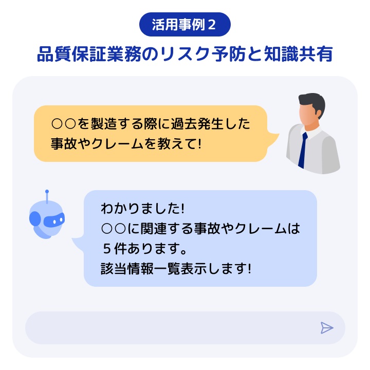 過去のクレーム事例や品質マニュアルを構造化し、生成AIで効率よく探し出せます。現場担当が日常の言葉で質問するだけで、類似事例や潜在的リスクを即座に把握できます。経験豊富な担当者の知識を組織全体で共有でき、品質トラブル等を未然に防止します。