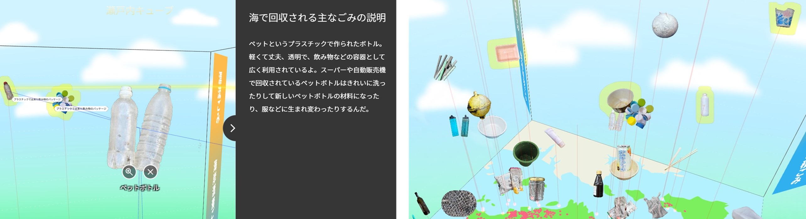 「みどころキューブ」のバーチャルな3D空間で、瀬戸内海で回収された海洋ごみを立体的に表現しました。浮遊するごみや沈むごみなど、見えにくい実態を可視化することで、体験的に学ぶことができます。