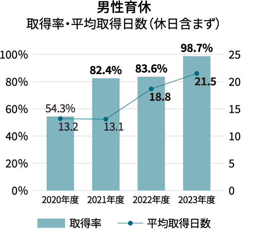 DNPは「男性育休100%宣言」を発しており、2023年度にはその取得率が98.7%となりました(女性の取得率は100%)。男女ともに育休の取得予定者と取得者は、社外のパートナーとともに「カンガルーの会」という育児セミナーに参加できます。また全社員が、男性育休への理解を深めるeラーニングを受講しています。社内のWebサイトでも男性育休取得者の体験談を発信するなど、誰もが次世代の育成に向けて活躍できる環境を整えています。