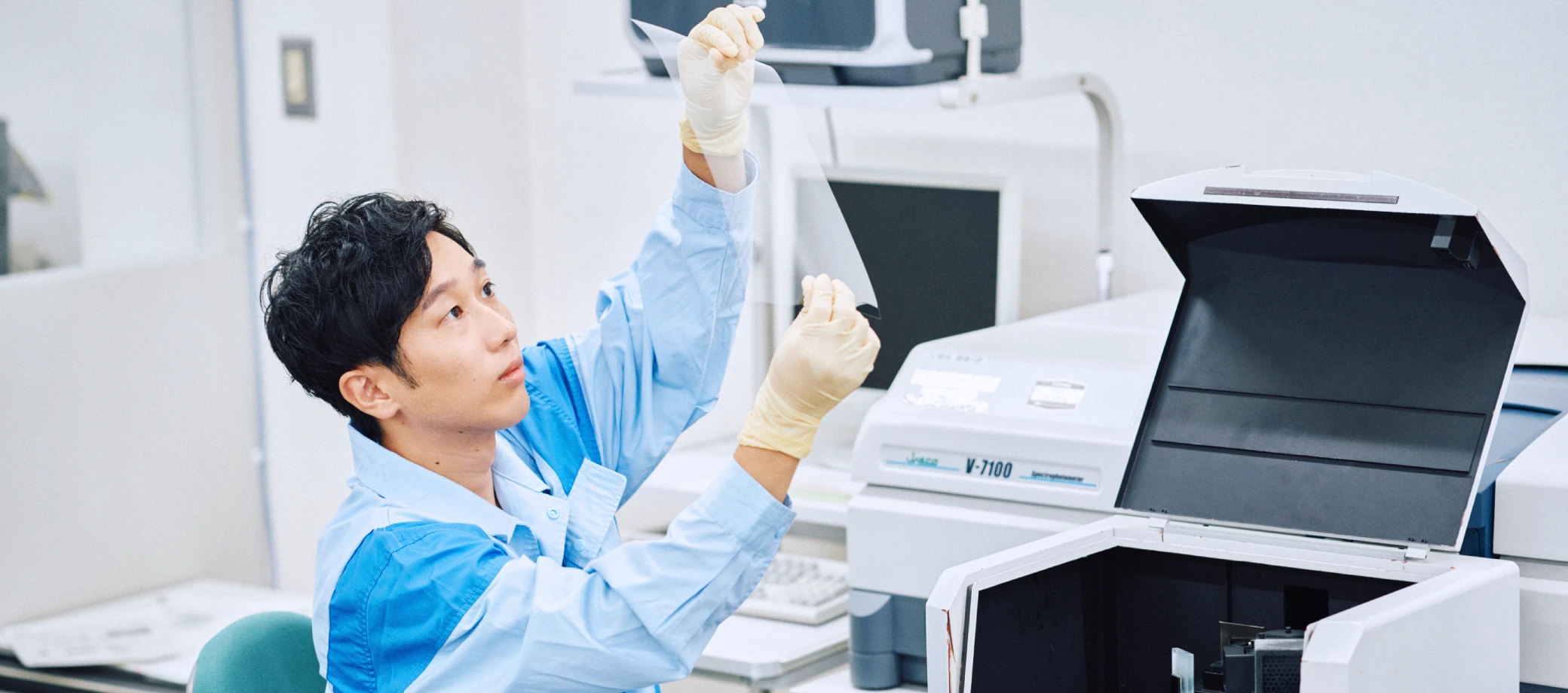 はい。ありがたいことに、入社の時から開発職としてキャリアを積ませてもらっています。現在研究開発しているのは、ノートパソコンやスマートフォン等のディスプレイの表面に使用して、光の映り込み等を防ぐ反射防止フィルムです。DNPは反射防止等の性能で業界トップクラスの技術を確立しています。私は、この製品へのさらなる機能「高硬度」の付与に向けて、反射防止性能と耐擦傷性能の両立を実現するための研究開発をしています。ラボで製品を試作し、評価・改善を重ねることで、大量生産の実現に向けて材料や製造方法を記した“レシピ”づくりをしています。